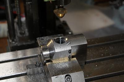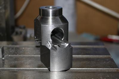 そして5mmだけ彫ってオスメスをバラしてさらに掘り込み、最終的に37mmの深穴をあけます。大きい旋盤を持っていれば、面盤や4爪チャックに取り付けてボーリングする、もしくはフライスを使うとしてもボーリングヘッドで掘るべき穴ですが今の私にはこれしか手がありません。