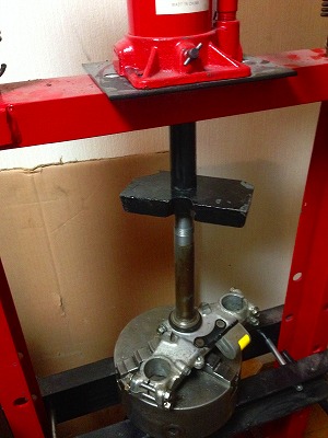まずはプレス(中華製・2万円台)でお預かりしたXL250Sのステムをばらします。このプレス、大活躍です。もうモトは取り尽くしたでしょう・・・。XL250Sのステムは完全な圧入ではなく、ボルトでクランプ止めしている仕組みです。ネジを緩めておけば容易に抜くことができます。