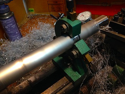 この作業は主軸モーターは使用せず、手まわしハンドルを使用して主軸を回します。1回あたりの切り込みは0.05mm程度、作業時間は10分もかかりません。