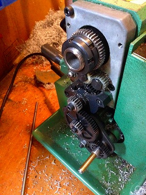 FL350EのようなC3ベースの旋盤であれば、標準キットでもねじ切り用のギア一式が付属しています。マニュアルをよく見て、ギアを組み付けます。