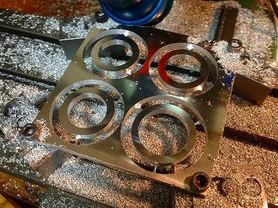 厚さ5mmと薄いものでしたので、得意の(?)CNC削り出しで作ります。バックラッシュをきっちりソフトウエア側で吸収していますので内側の円は0.05mm以下の精度で真円を保っています。外周は面取りをかねて軽くさらって面をだします。