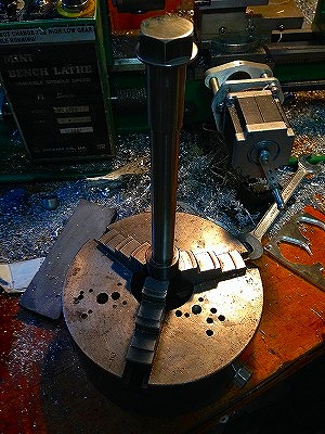 そう、このチャックは旋盤に取り付けるために購入したのではありません。「丸モノ専用バイス」として購入したのです。画像をご覧ください。垂直に掴むことが困難な220mm長のステンレス製アクスルシャフトを、いとも簡単に垂直に保持しています。